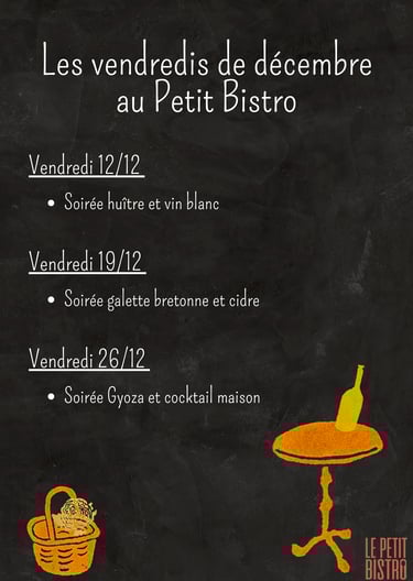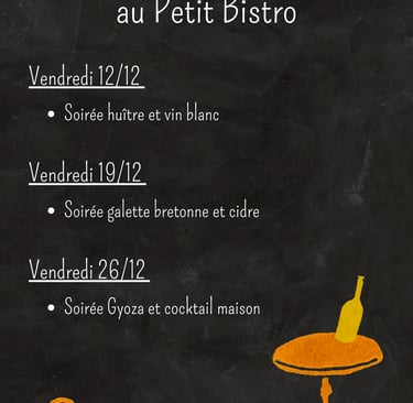 Au petit Bistro, les menus sont conçus en harmonie avec les saisons et changent chaque semaine, pour vous garantir des produits frais et de qualité. Tout est fait maison. Nous privilégions le circuit court, en collaborant avec des producteurs locaux passionnés.